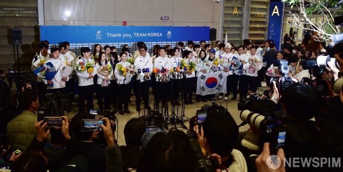 [영종도=뉴스핌] 류기찬 기자 = 2026 밀라노-코르티나담페초 동계올림픽을 마친 대한민국 선수단이 24일 오후 인천국제공항 제2여객터미널에서 귀국 인사를 하고 있다. 2026.02.24 ryuchan0925@newspim.com