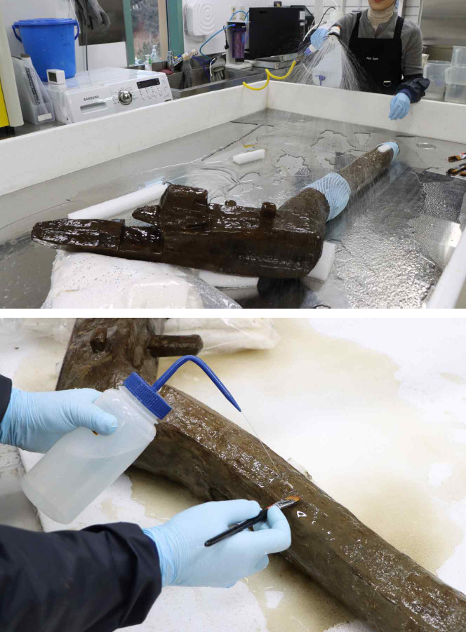 보존처리의 핵심은 두 가지였다. 먼저 약화된 목재 조직 안으로 수용성 수지인 폴리에틸렌글리콜(PEG)을 침투시켜 조직을 강화했다. 이어 영하 40도 이하에서 급속 동결한 뒤 진공 상태에서 수분을 기체로 바로 승화시키는 진공동결건조법을 적용해 건조 과정에서 발생할 수 있는 추가 변형을 막았다.