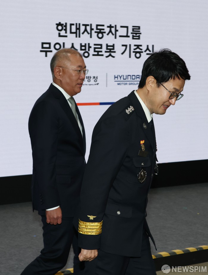 [남양주=뉴스핌] 김현우 기자 = 정의선 현대차그룹 회장과 김승룡 소방청장 직무대행이 24일 오후 경기도 남양주 수도권119특수구조대에서 열린 현대자동차그룹-소방청 무인소방로봇 기증식에 참석하고 있다. 2026.02.24 khwphoto@newspim.com