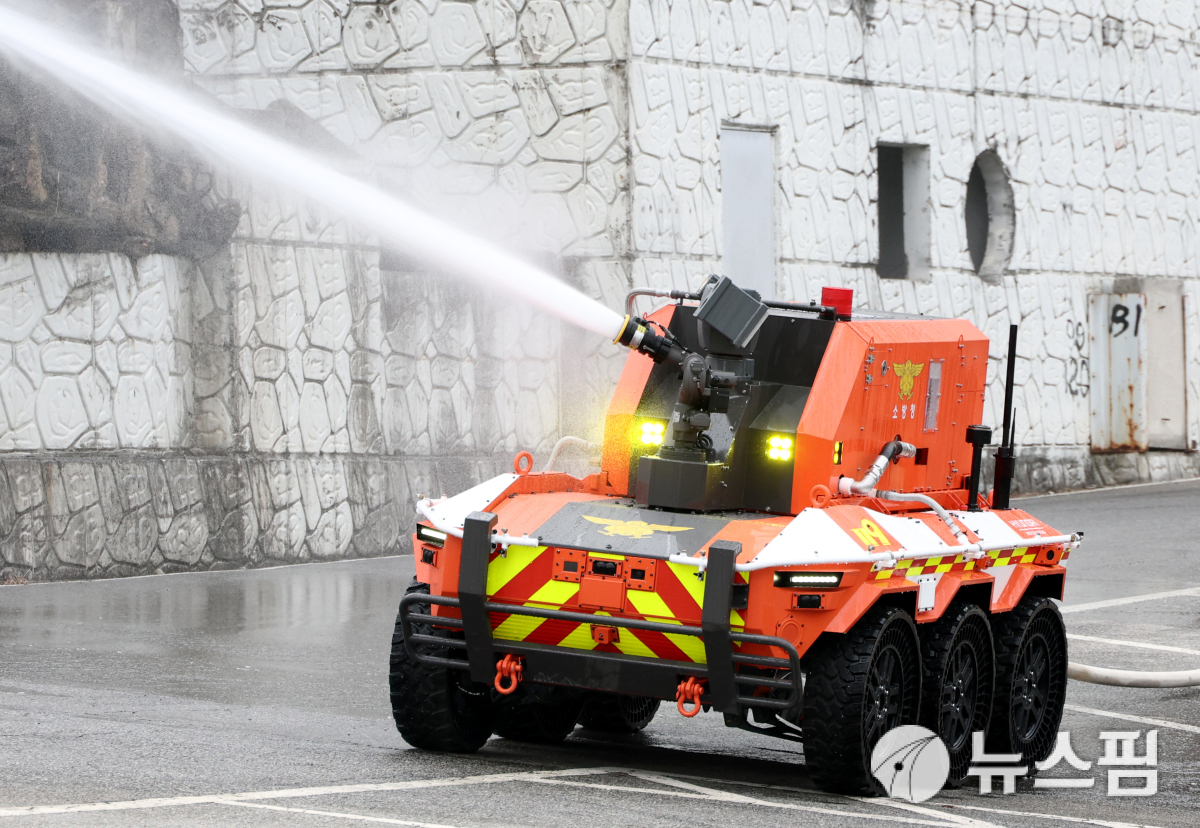 또한 무인소방로봇은 고열에도 견딜 수 있는 특수 타이어가 장착됐다. 6륜 독립구동이 가능한 인휠모터 시스템이 탑재돼 화재 잔해나 장애물이 많은 사고 현장에서 원활한 원격 주행 및 임무 수행이 가능하다.