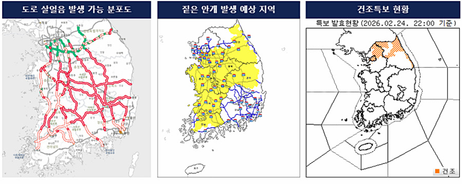 특히 기온이 낮은 교량과 고가도로, 터널 입·출구, 이면 도로나 골목길, 경사진 도로, 그늘진 도로 등을 중심으로 빙판길과 도로 살얼음 발생 가능성이 더욱 높겠다. 교통 안전과 보행자 안전에 각별히 주의해야 한다.