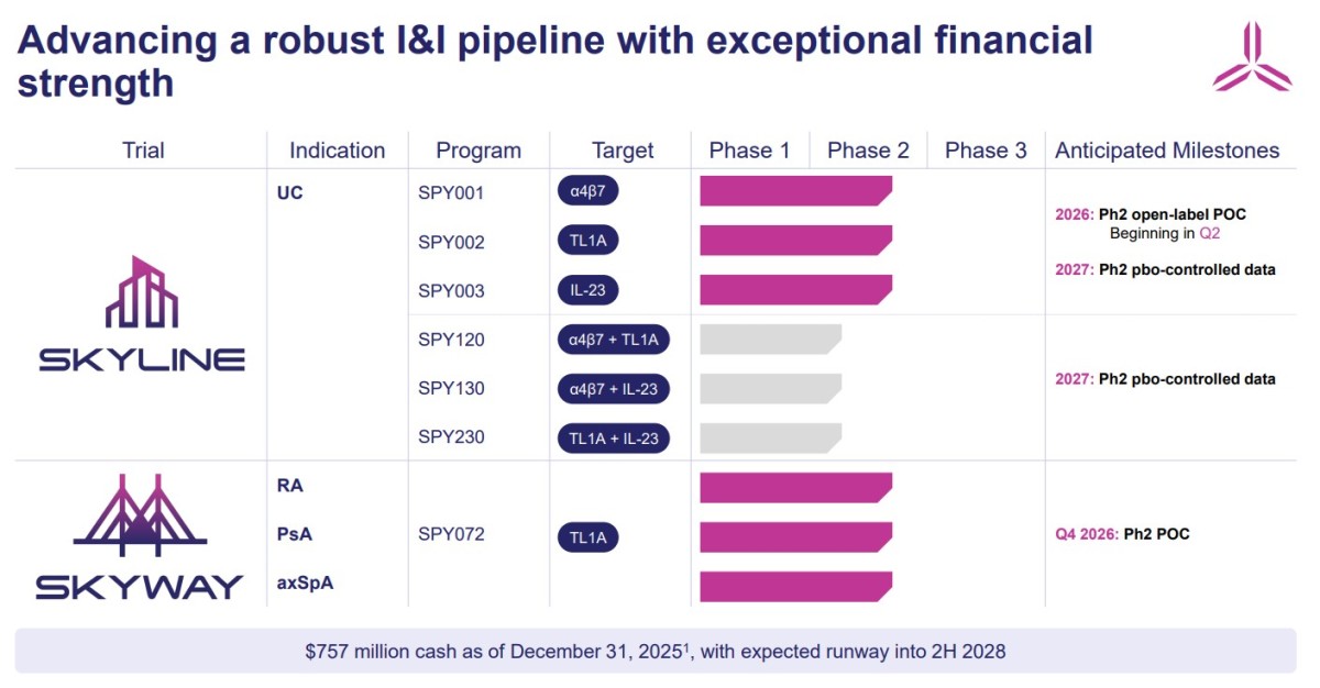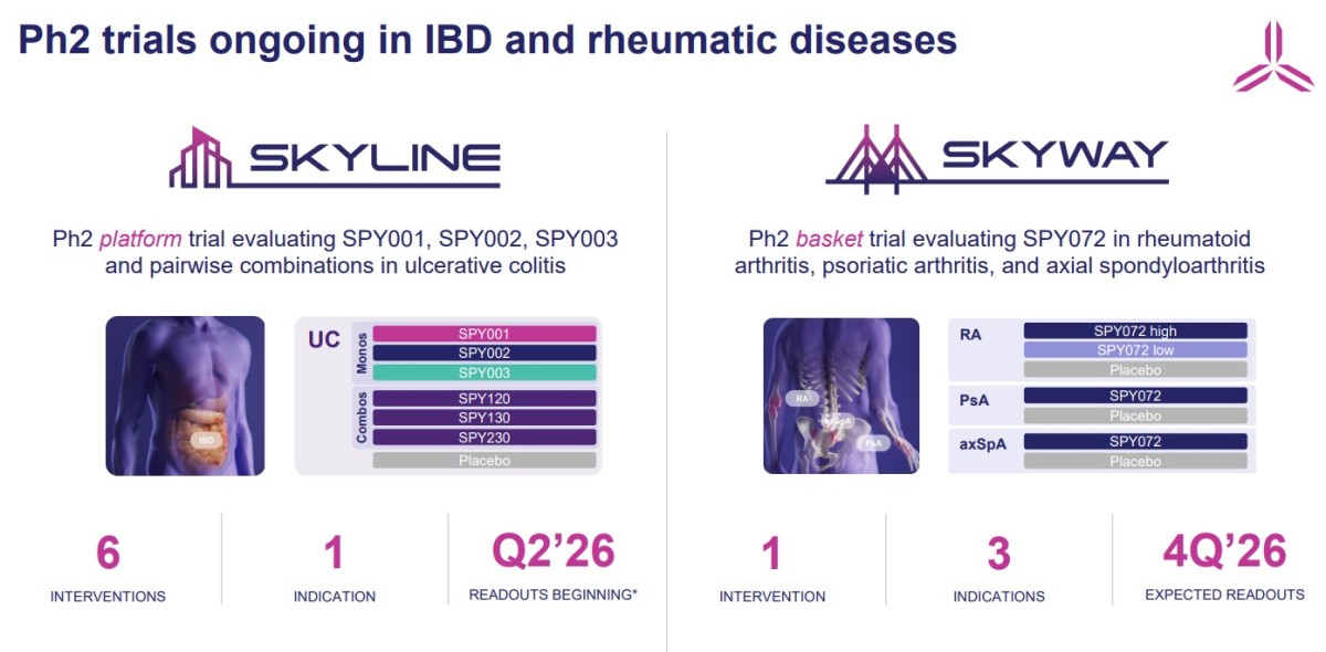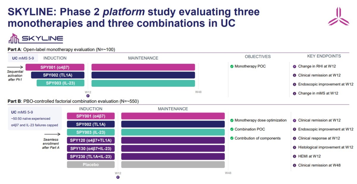 SKYLINE 2상 플랫폼 임상시험은 중등도에서 중증 활동성 궤양성 대장염 환자를 대상으로 SPY001, SPY002, SPY003 및 이들의 조합(총 6종 후보물질)에 대한 유도 및 유지 치료를 평가하는 시험이다. 2025년 5월 시험이 개시됐으며, 현재 1부 등록은 계획보다 빠르게 진행되고 있다.