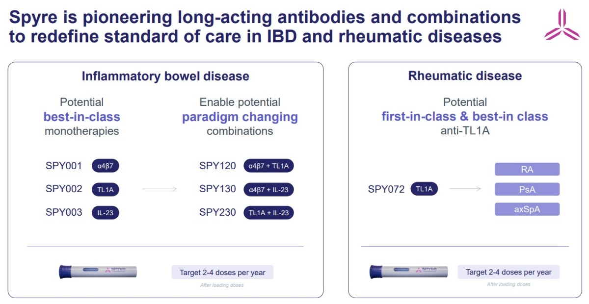 스파이어 테라퓨틱스는 2013년 설립되어 미국 매사추세츠주 월섬에 본사를 두고 있는 임상 단계 바이오테크 기업이다. 회사의 핵심 전략은 반감기(Half-life, 약물의 혈중 농도가 절반으로 감소하는 데 걸리는 시간)를 획기적으로 연장한 항체(Half-life Extended Antibody, HLE) 기술을 기반으로 투약 빈도를 대폭 줄이면서도 치료 효과를 극대화하는 데 있다. 현재 IBD와 류머티즘 질환이라는 두 개의 대형 적응증을 타깃으로, α4β7, TL1A, IL-23이라는 세 가지 검증된 표적을 겨냥한 항체 후보물질들을 개발하고 있다.