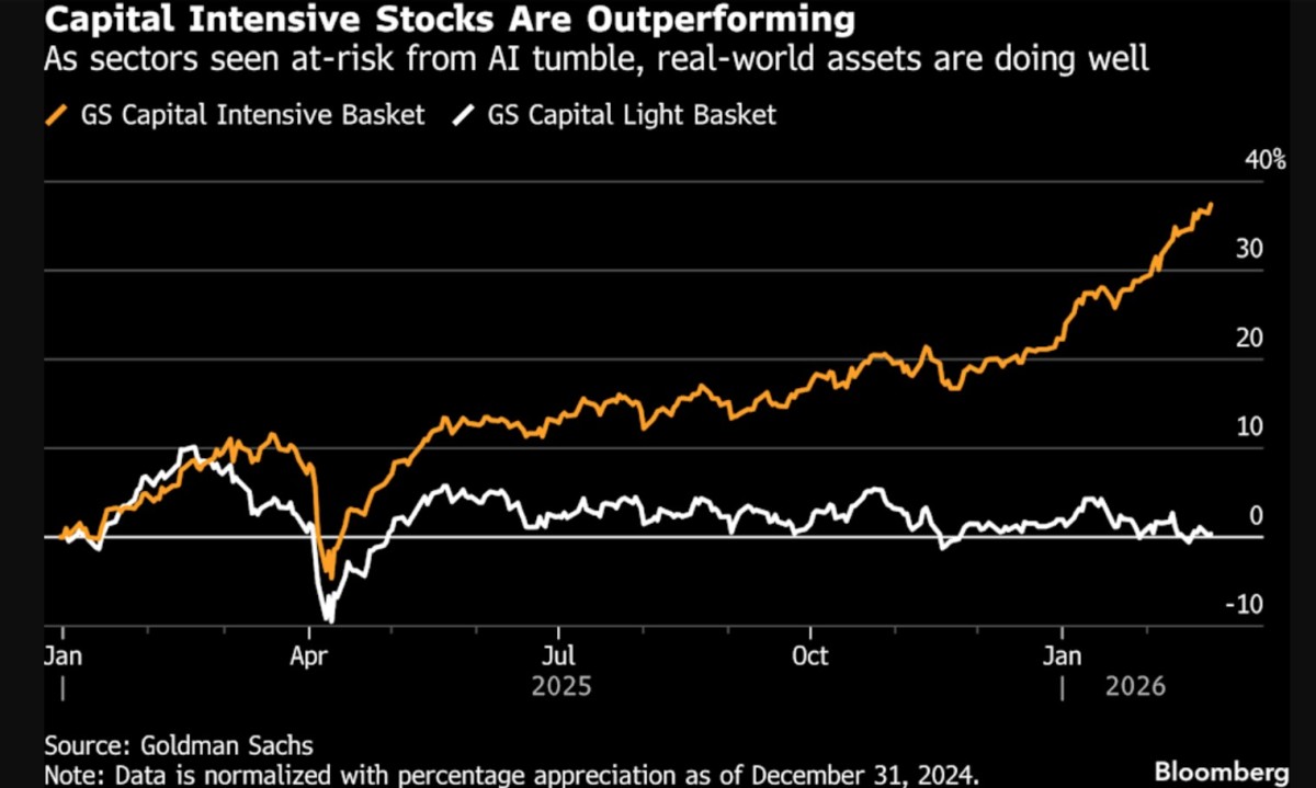 골드만삭스 팀은 물리적 자산에서 경제적 가치가 발생하는 자본집약적 기업들의 주식 바스켓이 인적 자본이나 디지털 자본에 의존하는 자본경량형 그룹보다 2025년 초 이후 약 35%가량 더 높은 성과를 냈다고 밝혔다.