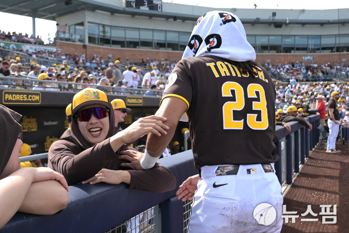 [피오리아 로이터=뉴스핌] 장환수 스포츠전문기자= 샌디에이고 송성문이 24일 밀워키전에서 페르난도 타티스 주니어(23번)와 얘기하며 활짝 웃고 있다. 2026.02.25 zangpabo@newspim.com