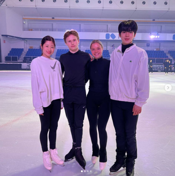 [서울=뉴스핌] 장환수 스포츠전문기자= 이해인과 일리야 말리닌이 이탈리아 밀라노에서 올림픽 기간 중 같이 찍은 사진. 둘의 SNS에는 같이 찍은 사진이 유난히 많다. 왼쪽부터 차준환, 말리닌, 이해인, 신지아. [사진=이해인 SNS] 2026.02.25 zangpabo@newspim.com