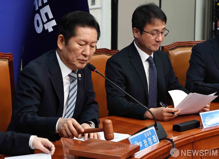 [서울=뉴스핌] 윤창빈 기자 = 정청래 더불어민주당 대표가 25일 서울 여의도 국회에서 열린 최고위원회의에서 의사봉을 두드리고 있다. 2026.02.25 pangbin@newspim.com