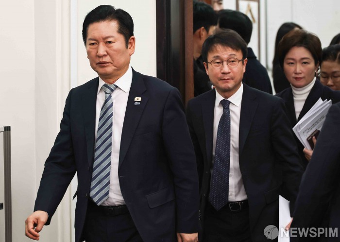 [서울=뉴스핌] 윤창빈 기자 = 정청래 더불어민주당 대표, 한병도 원내대표가 25일 서울 여의도 국회에서 열린 최고위원회의에 참석하고 있다. 2026.02.25 pangbin@newspim.com