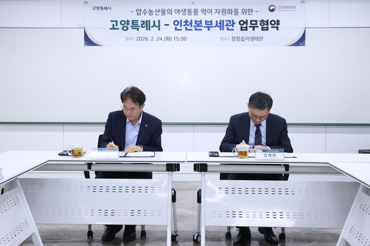 이동환 고양특례시장(왼쪽)과 고석진 인천본부세관장이 장항습지 야생동물 생태환경 지원 업무협약을 체결하고 있다. [사진=고양시] 2026.02.25 atbodo@newspim.com