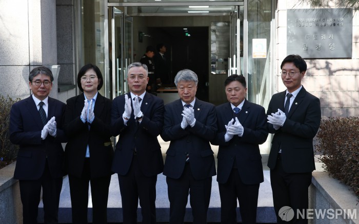 [과천=뉴스핌] 김현우 기자 = 권창영 2차 종합특검팀 특별검사(왼쪽 세번째)를 비롯한 특검보 등 직원들이 25일 오전 경기 과천시 2차 종합특검팀 사무실 앞에서 열린 현판식에서 박수를 치고 있다. 2026.02.25 khwphoto@newspim.com