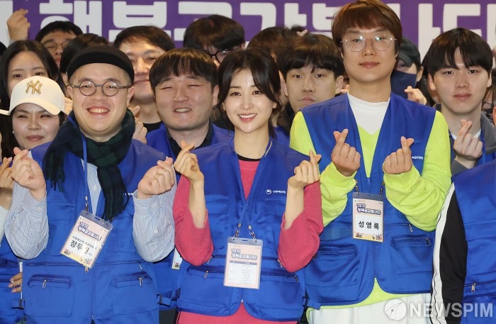 [서울=뉴스핌] 정일구 기자 = 임기근 기획예산처 장관 직무대행 차관과 복권홍보대사 겸 행복공감봉사단장인 배우 박하선이 25일 오전 서울 종로구 초동교회에서 열린 '제19기 행복공감봉사단 발대식 및 1차 봉사활동'에서 참석자들과 기념촬영을 하고 있다. 2026.02.25 mironj19@newspim.com