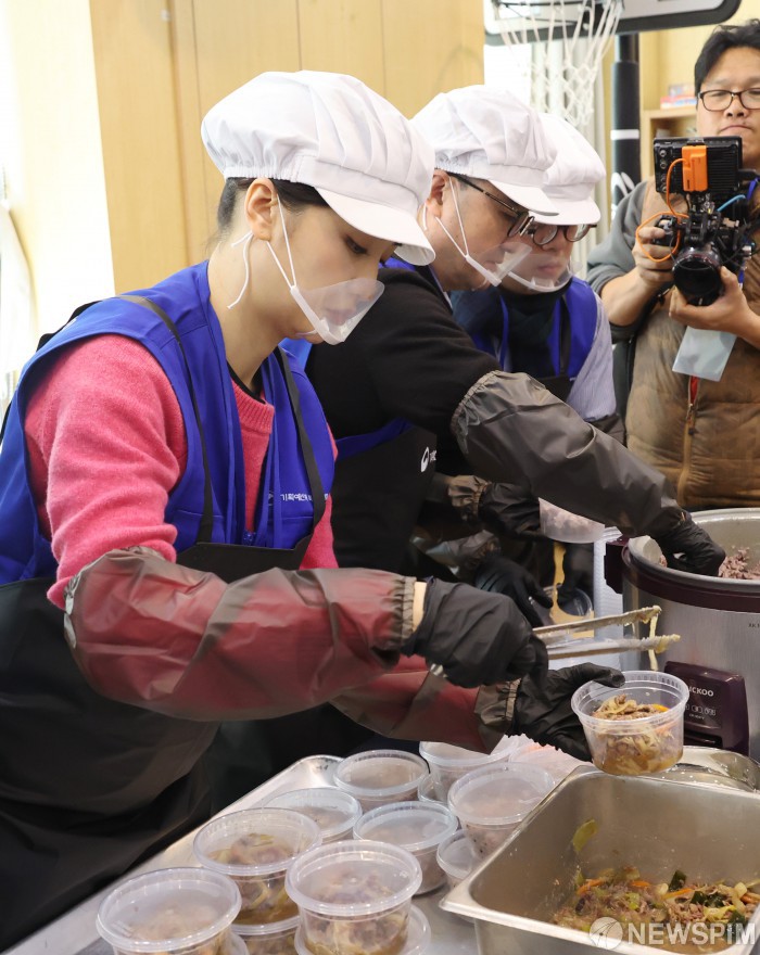 [서울=뉴스핌] 정일구 기자 = 임기근 기획예산처 장관 직무대행 차관과 복권홍보대사 겸 행복공감봉사단장인 배우 박하선이 25일 오전 서울 종로구 초동교회에서 열린 '제19기 행복공감봉사단 발대식 및 1차 봉사활동'에서 쪽방촌 주민들에게 전달한 도시락을 포장하고 있다. 2026.02.25 mironj19@newspim.com