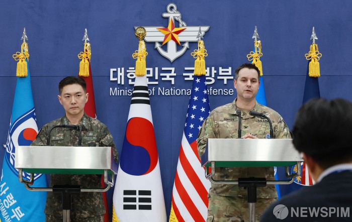 [서울=뉴스핌] 사진공동취재단 = 라이언 도날드 주한미군사 공보실장(오른쪽)이 25일 오후 서울 용산구 국방부에서 2026 자유의방패(FS) 연습 계획 브리핑을 하고 있다. 2026.02.25 photo@newspim.com