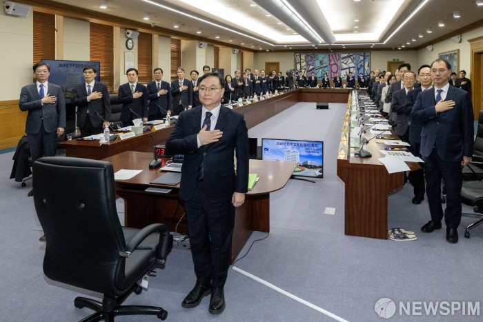 [서울=뉴스핌] 류기찬 기자 = 박영재 법원행정처장을 비롯한 법원장들이 25일 오후 서울 서초구 대법원에서 열린 ‘전국법원장회의 임시회의’에서 국민의례를 하고 있다. 2026.02.25 ryuchan0925@newspim.com