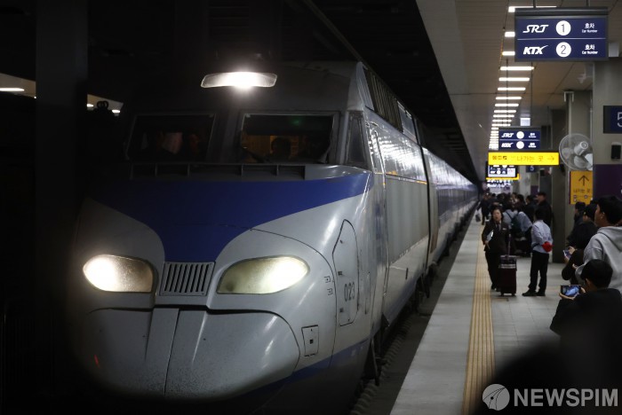 [서울=뉴스핌] 김현우 기자 = 25일 오후 서울 강남구 수서역에 부산발 KTX가 승강장에 들어서고 있다. KTX는 수서역∼부산역을, SRT는 서울역∼부산역을 매일 각 1회 왕복 운행한다. 2026.02.25 khwphoto@newspim.com