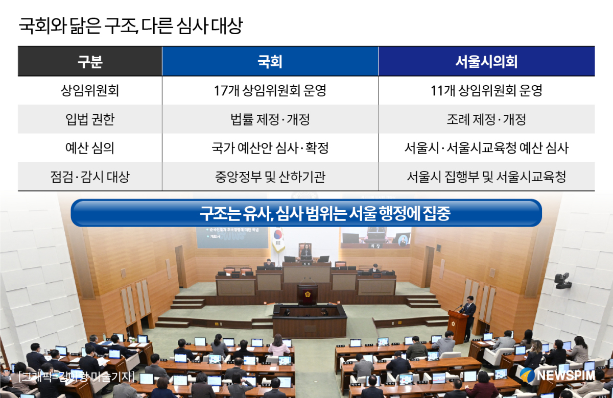 국회가 국가 단위 법률과 중앙정부 예산을 다룬다면, 서울시의회는 서울시와 서울시교육청 예산, 조례를 다룬다. 법률 대신 조례를 제정·개정하며, 중앙정부가 아닌 서울시 행정조직과 교육청을 감사한다.