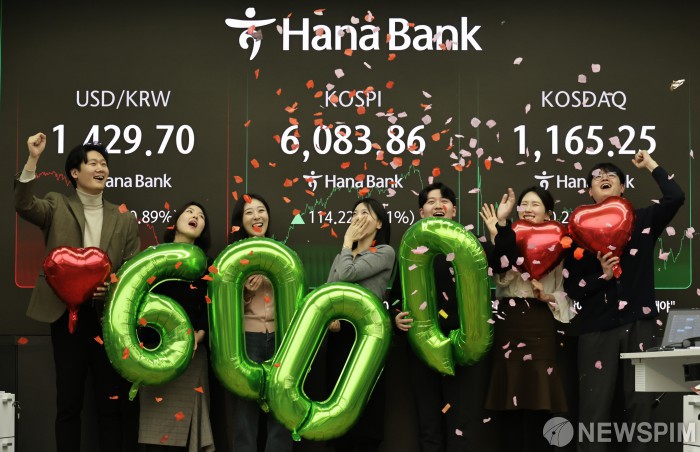 [서울=뉴스핌] 양윤모 기자= 25일 오후 코스피가 전장 종가보다 114.22 포인트(1.91%) 상승하며 6083.86으로, 코스닥은 0.25 포인트(0.02%) 상승한 1165.25로 거래를 마감한 가운데, 서울 중구 하나은행 을지로본점 딜링룸에서 직원들이 축하 세레머니를 하고 있다. 서울외환시장에서 달러/원 환율은 전장 대비 12.70원 하락한 1429.80원에 주간거래를 마감했다. 2026.02.25 yym58@newspim.com