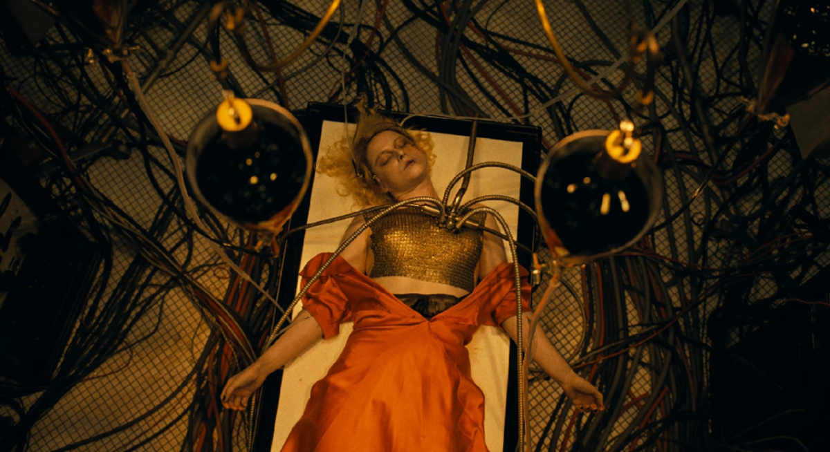 공개된 보도스틸은 작품 속 획기적인 '브라이드'와 '프랑켄슈타인'의 모습을 통해 고전 서사에 대한 대담한 재해석을 암시한다. 먼저, 천재 과학자 '유프로니우스 박사'(아네트 베닝)의 실험대 위에 누워있는 '브라이드'. 화려한 주황색 원피스를 입은 금발의 그녀가 목이 꺾인 채 쓰러져 의문의 검은 용액을 주입 받고 있는 상황은 처음부터 예사롭지 않은 인상을 남긴다.
