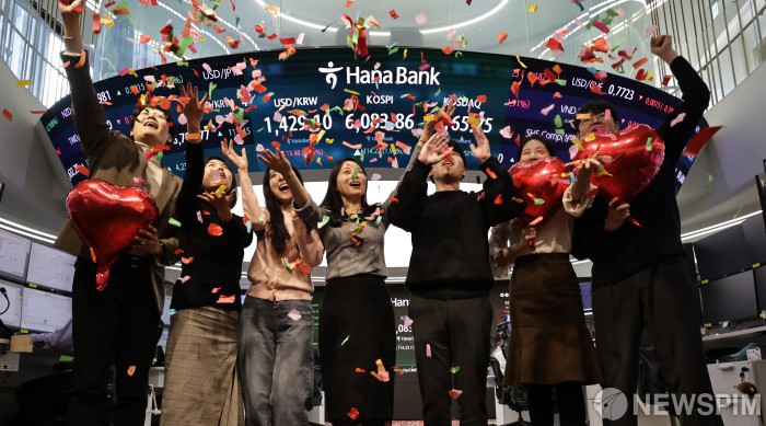 [서울=뉴스핌] 양윤모 기자 = 25일 오후 1980년 코스피 시장이 열린지 46년 만에 사상 처음으로 6083.86으로 마감한 가운데, 서울 중구 하나은행 을지로본점 딜링룸에서 직원들이 축하 세레머니를 하고 있다. 2026.02.25 yym58@newspim.com