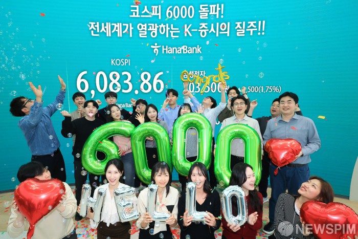 [서울=뉴스핌] 양윤모 기자 = 25일 오후 1980년 코스피 시장이 열린지 46년 만에 사상 처음으로 6083.86으로 마감한 가운데, 서울 중구 하나은행 을지로본점 딜링룸에서 직원들이 축하 세레머니를 하고 있다. 2026.02.25 yym58@newspim.com