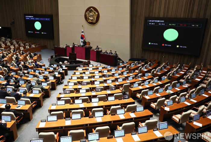 [서울=뉴스핌] 윤창빈 기자 = 25일 서울 여의도 국회에서 열린 본회의에서 상법 일부개정법률안(대안)이 가결되고 있다. 2026.02.25 pangbin@newspim.com