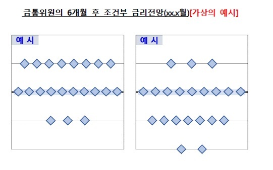 앞으로 통화정책방향 결정회의에서 기존 '3개월 내 금리전망' 대신 '6개월 후 금리전망'을 제시하고, 금통위원별로 3개의 점을 찍어 기준금리의 베이스라인과 상·하방 리스크를 함께 나타내는 방식이다. 정책 커뮤니케이션의 명확성과 예측 가능성을 높이기 위한 조치다.