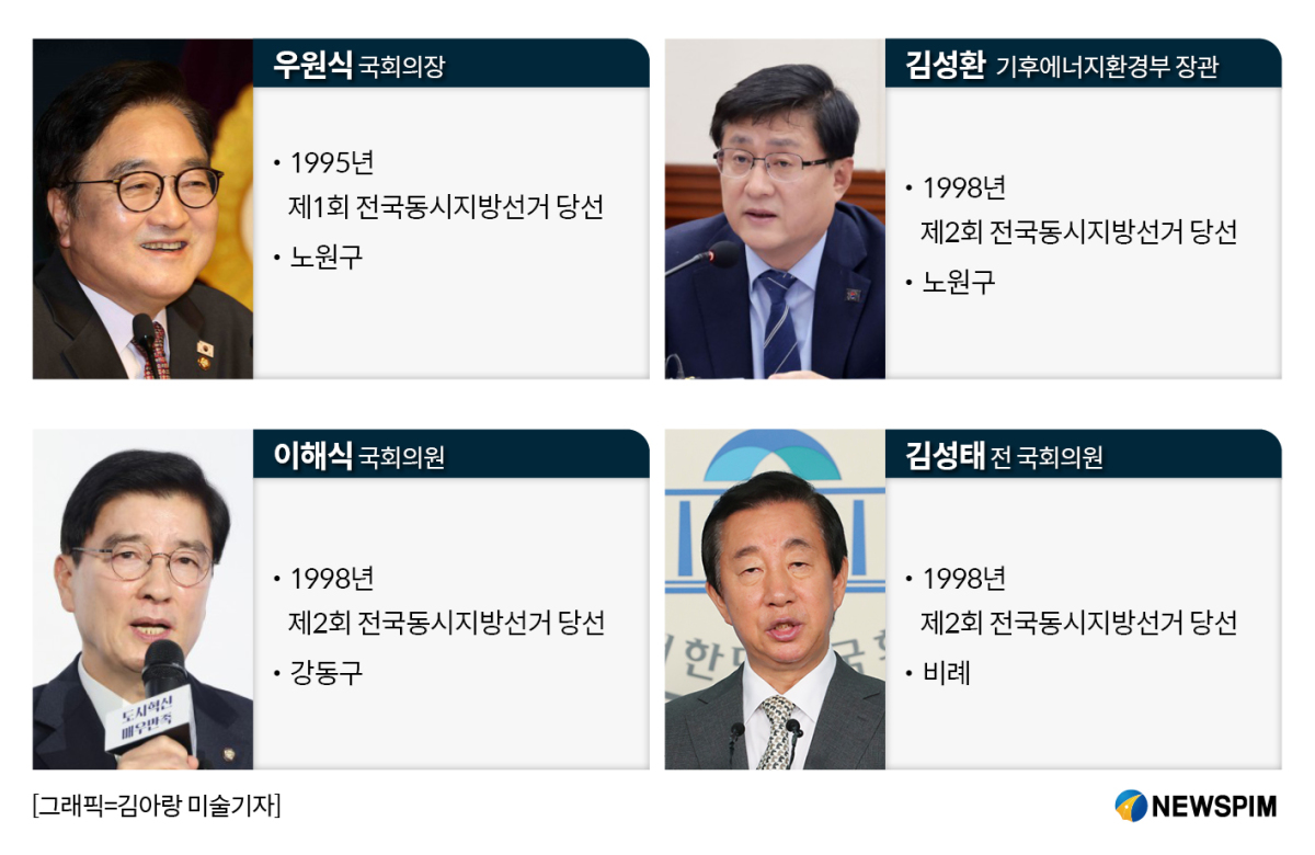 우원식 의장은 1995년 첫 전국동시지방선거를 통해 제4대 서울시의회 의원(노원3선거구)에 당선되며 정치인으로서의 경력을 시작했다. 이후 서울 노원을 국회의원과 민주당 원내대표를 거쳐 제22대 국회 전반기 국회의장 자리에 올랐다. 우 의장의 사례는 광역의회 경력이 국회 권력의 최정점까지 이어졌다는 '풀뿌리 민주주의'의 상징이다.