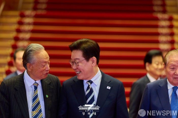 [서울=뉴스핌] 이재명 대통령이 지난 25일 서울 종로구 청와대에서 열린 더불어민주당 상임고문단 오찬 간담회에서 권노갑 김대중재단 이사장과 대화를 나누고 있다. [사진=청와대] 2026.02.26 photo@newspim.com