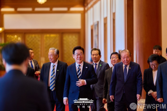 [서울=뉴스핌] 이재명 대통령이 지난 25일 서울 종로구 청와대에서 열린 더불어민주당 상임고문단 오찬 간담회에서 참석자들과 기념촬영을 마치고 이동하고 있다. [사진=청와대] 2026.02.26 photo@newspim.com