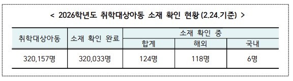 교육부에 따르면 학교·지자체·경찰이 협력해 확인한 결과, 올해 취학대상아동 32만157명 가운데 99.9%인 32만33명의 소재가 최종 확인됐다.