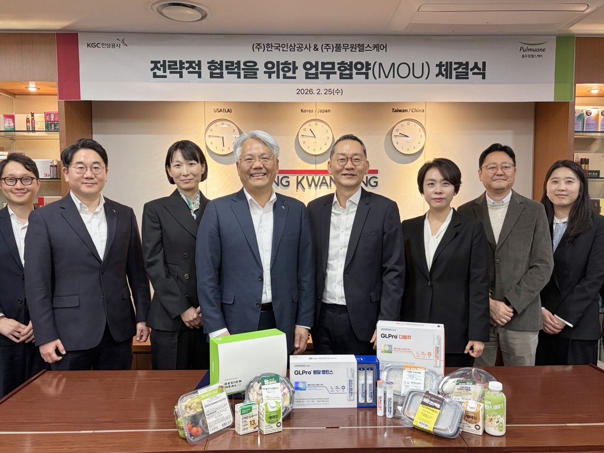 [서울=뉴스핌] 조민교 기자 = KGC인삼공사는 풀무원헬스케어와 시니어 건강 및 혈당 케어 시장 확대를 위한 업무협약(MOU)을 25일 서울 강남구 대치동에서 체결했다고 26일 밝혔다. 양측은 혈당관리 구독 프로그램 공동개발과 프리미엄 건강 식단 개발, 데이터 기반 시니어 시장 분석 등을 통해 성장 중인 헬스케어 시장 공략에 속도를 낸다는 전략이다.
