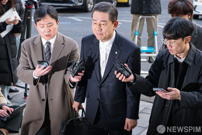 [서울=뉴스핌] 류기찬 기자 = 13가지 의혹을 받는 김병기 무소속 의원이 26일 오전 서울 마포구 서울경찰청 공공범죄수사대에 조사를 받기 위해 출석하고 있다. 2026.02.26 ryuchan0925@newspim.com