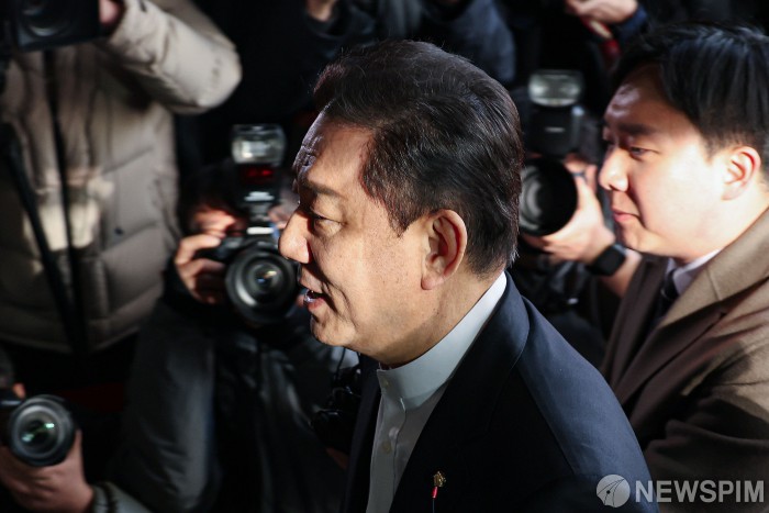 [서울=뉴스핌] 류기찬 기자 = 13가지 의혹을 받는 김병기 무소속 의원이 26일 오전 서울 마포구 서울경찰청 공공범죄수사대에 조사를 받기 위해 출석하고 있다. 2026.02.26 ryuchan0925@newspim.com