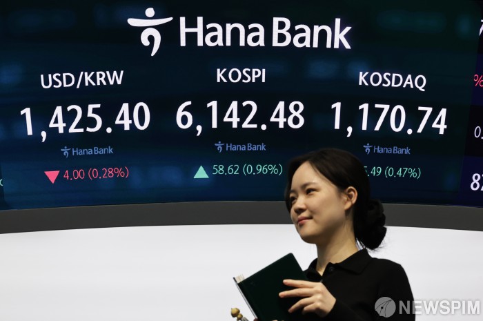 [서울=뉴스핌] 양윤모 기자= 26일 오전 코스피가 전장 종가보다 58.62포인트(0.96%) 상승하며 6142.48로, 코스닥은 5.49포인트(0.47%) 상승한 1170.74로 거래를 시작한 가운데, 서울 중구 하나은행 을지로본점 딜링룸에서 직원들이 업무를 보고 있다. 서울외환시장에서 달러/원 환율은 전장 대비 4.00원 하락한 1425.40원에 주간거래를 시작했다. 2026.02.26 yym58@newspim.com
