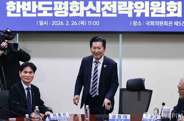 [서울=뉴스핌] 윤창빈 기자 = 정청래 더불어민주당 대표가 26일 오전 서울 여의도 국회 의원회관에서 열린 한반도평화신전략위원회 출범식에 참석하고 있다. 2026.02.26 pangbin@newspim.com