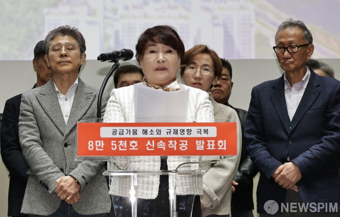 [서울=뉴스핌] 양윤모 기자 = 26일 오전 서울시청 본관 3층 대회의실에서 착공예정 구역 조합장 및 조합원이 참석한 가운데 개최된 '서울시 핵심 주택공급 전략사업 발표회'에 참석한 주택조합장이 호소문을 낭독하고 있다. 2026.02.26 yym58@newspim.com