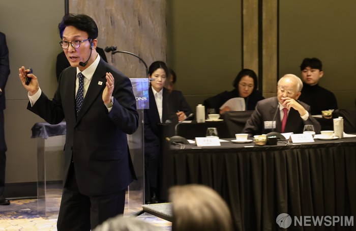 [서울=뉴스핌] 류기찬 기자 = 김민석 국무총리가 26일 오후 서울 종로구 포시즌스 호텔 서울에서 열린 ‘한국경영자총협회 오찬 간담회 및 K-국정설명회’에서 강연을 하고 있는 가운데, 손경식 경총 회장이 거울에 비치고 있다. 2026.02.26 ryuchan0925@newspim.com