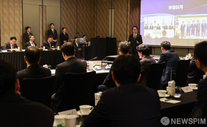 [서울=뉴스핌] 류기찬 기자 = 김민석 국무총리가 26일 오후 서울 종로구 포시즌스 호텔 서울에서 열린 ‘한국경영자총협회 오찬 간담회 및 K-국정설명회’에서 강연을 하고 있다. 2026.02.26 ryuchan0925@newspim.com