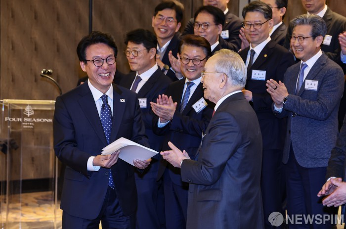 [서울=뉴스핌] 류기찬 기자 = 김민석 국무총리가 26일 오후 서울 종로구 포시즌스 호텔 서울에서 열린 '한국경영자총협회 오찬 간담회 및 K-국정설명회'에서 손경식 경총 회장에게 건의사항을 전달받고 있다. 2026.02.26 ryuchan0925@newspim.com