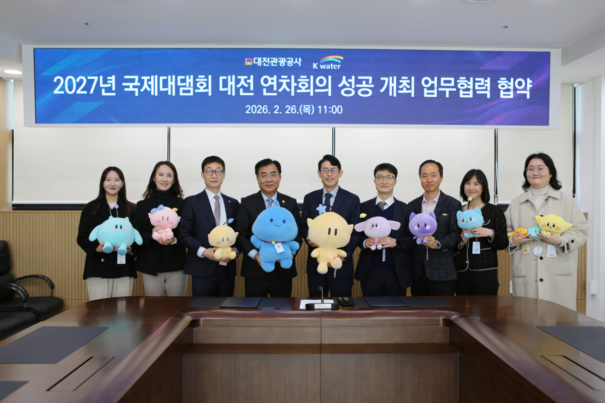 [대전=뉴스핌] 오영균 기자 = 대전관광공사는 26일 공사 대회의실에서 내년 대전에서 개최되는 '2027 국제대댐회 제95회 연차회의(ICOLD 2027)'의 성공적인 개최를 위해 한국수자원공사와 업무협약(MOU)을 체결했다고 밝혔다.