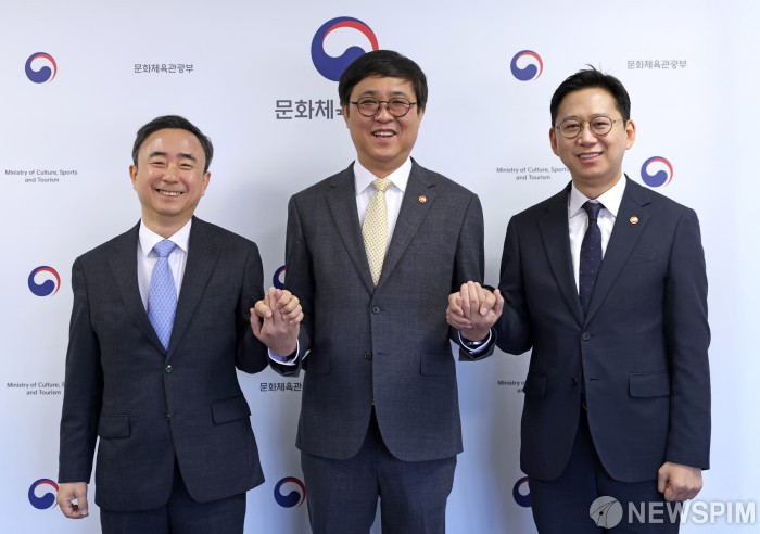 [서울=뉴스핌] 임문영 국가인공지능전략위원회 부위원장(왼쪽부터), 최휘영 문화체육관광부 장관,배경훈 부총리 겸 과학기술정보통신부 장관이 26일 오전 서울 종로구 국립현대미술관 서울관에서 열린 '공정이용 안내서 관계부처 간담회'에서 기념촬영을 하고 있다.[사진=과학기술정보통신부] 2026.02.26 photo@newspim.com