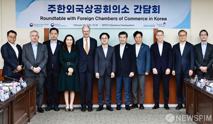 [서울=뉴스핌] 김정관 산업통상부 장관이 25일 오전 서울 영등포구 한국전력공사 남서울본부 대회의실에서 김영훈 고용노동부 장관을 비롯한 미국, 유럽, 일본 등 주한 외국상공회의소 대표 및 관계자가 참석한 가운데 열린 '주한 외국상공회의소 간담회'에서 기념촬영을 하고 있다. [사진=산업통상부] 2026.02.26 photo@newspim.com