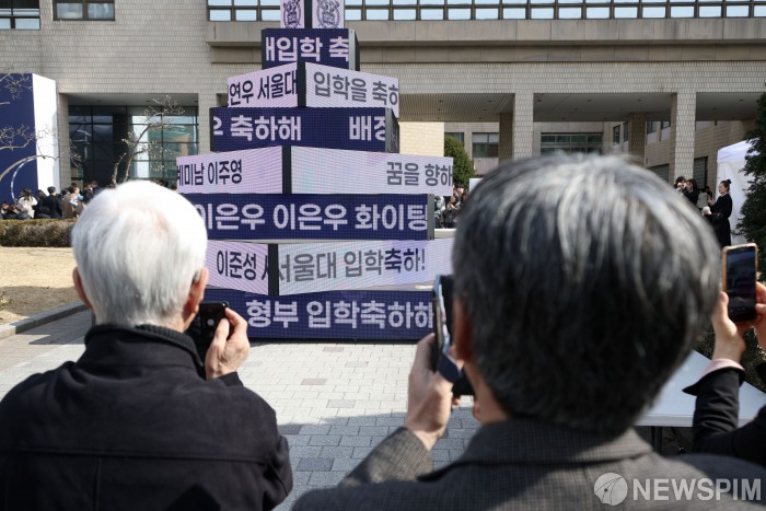 [서울=뉴스핌] 이건주 인턴기자 = 26일 오전 서울 관악구 서울대학교 관악캠퍼스에서 열린 입학식에 참석한 신입생들과 가족들이 기념사진을 촬영하고 있다. 2026.02.26 kunjoo@newspim.com
