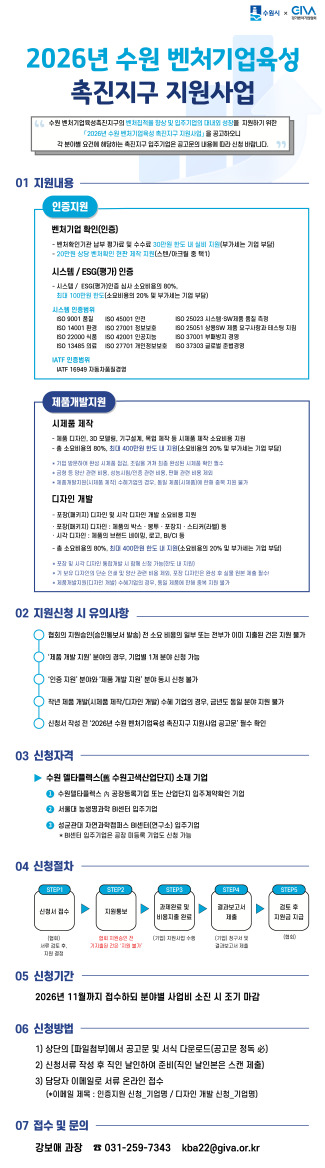 수원시, '2026년 수원 벤처기업육성촉진지구 활성화사업' 참여 기업 모집