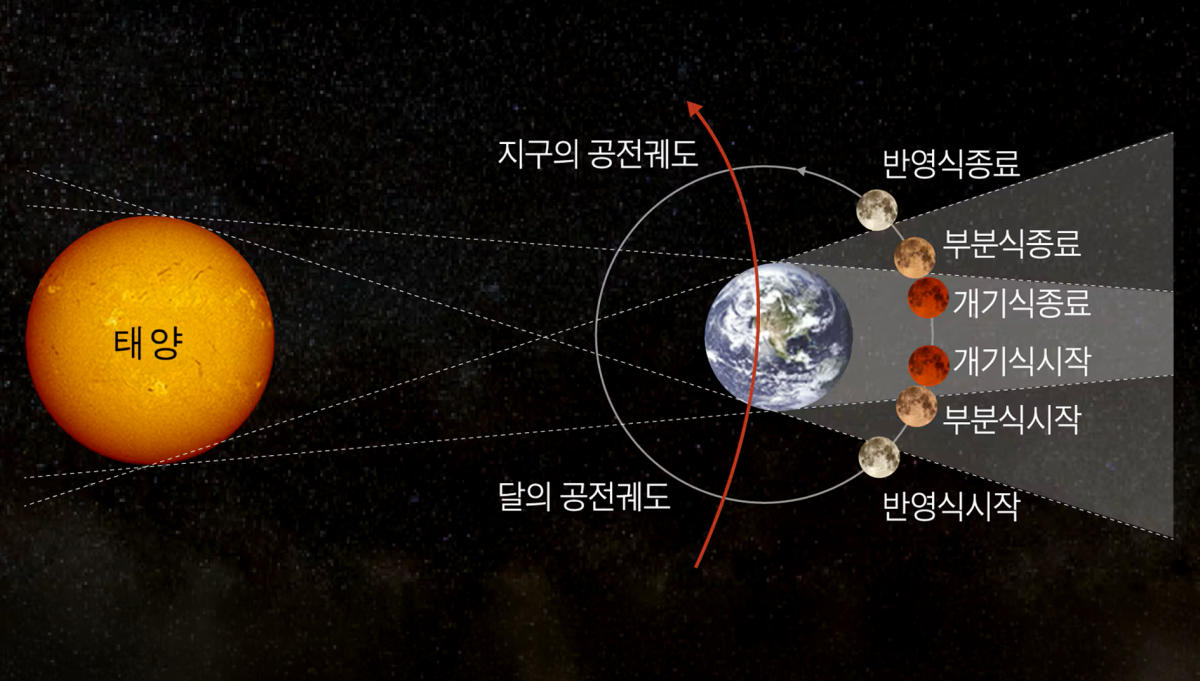 개기월식은 태양·지구·달이 일직선으로 놓일 때 달이 지구 본그림자 속으로 들어가면서 발생한다. 달은 완전히 사라지지 않고, 지구 대기를 거친 태양빛이 굴절돼 붉은빛을 띠는 '붉은 달'로 변한다.
