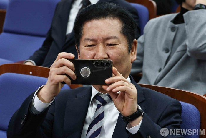 [서울=뉴스핌] 윤창빈 기자 = 정청래 더불어민주당 대표가 26일 오후 서울 여의도 국회에서 열린 의원총회에서 취재진을 촬영하고 있다. 2026.02.26 pangbin@newspim.com