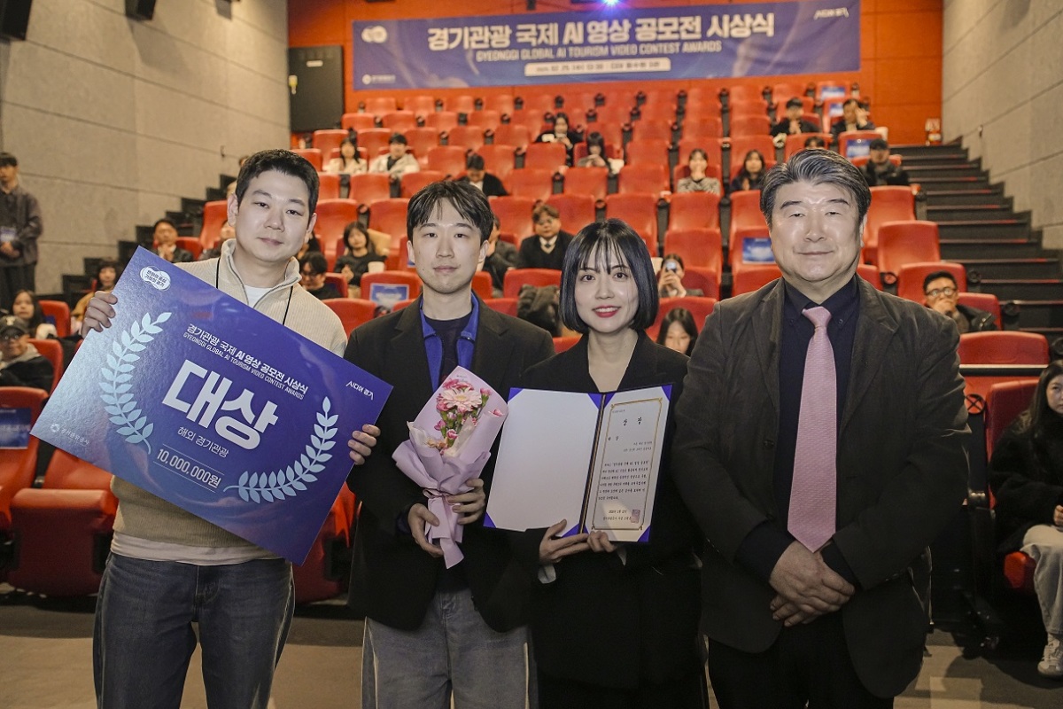 경기관광 국제 AI 영상공모전 시상식 (대상 수상자 팀 라이브나우 및 경기관광공사 조원용 사장). [사진=경기관광공사]