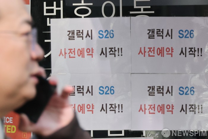 [서울=뉴스핌] 이형석 기자 = 갤럭시 S26 사전예약이 시작된 27일 오전 서울 여의도 인근 핸드폰 판매점에 안내문이 붙어 있다. 사전예약은 오늘부터 3월 5일까지 진행한다. 2026.02.27 leehs@newspim.com