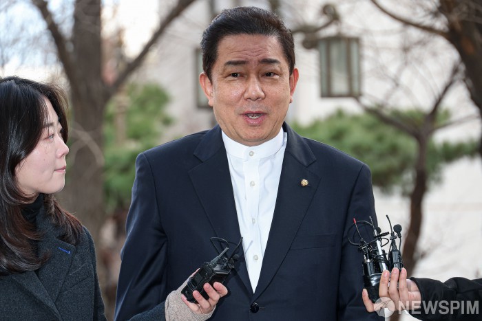 [서울=뉴스핌] 류기찬 기자 = 공천헌금 수수 의혹 등 여러 의혹을 받고 있는 김병기 무소속 의원이 27일 오전 서울 마포구 서울경찰청 공공범죄수사대에 2차 조사를 받기 위해 출석하며 입장을 밝히고 있다. 2026.02.27 ryuchan0925@newspim.com