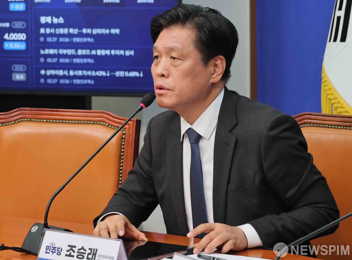 [서울=뉴스핌] 윤창빈 기자 = 조승래 더불어민주당 중앙당 공천관리위원회 부위원장이 27일 오전 서울 여의도 국회에서 취재진 질문에 답변하고 있다. 이날 중앙당 공관위는 6·3 지방선거 강원도지사 후보로 우상호 전 청와대 정무수석을 단수 공천하기로 했다. 2026.02.27 pangbin@newspim.com
